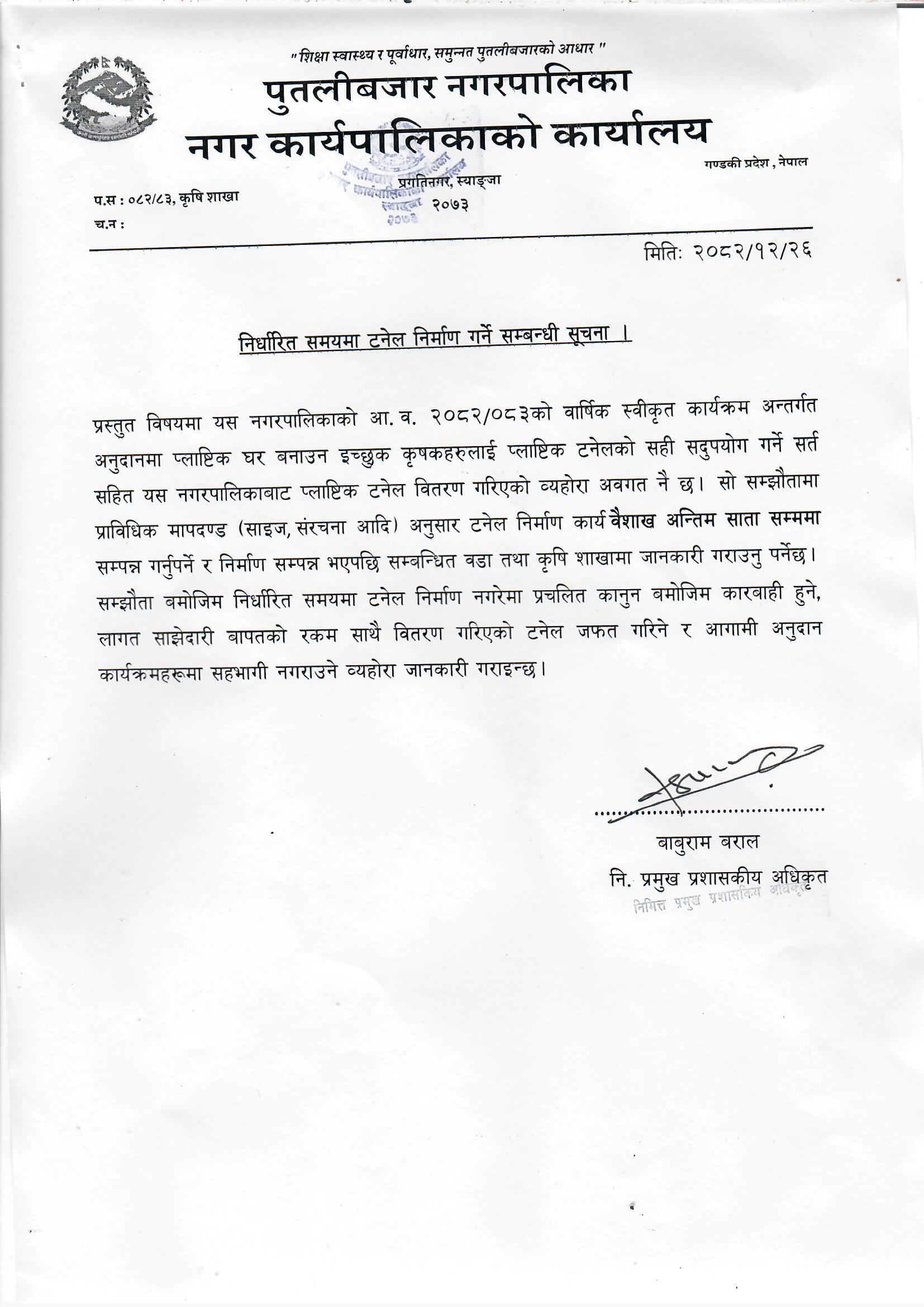निर्धारित समयमा टनेल निर्माण गर्ने सम्बन्धी सूचना ।