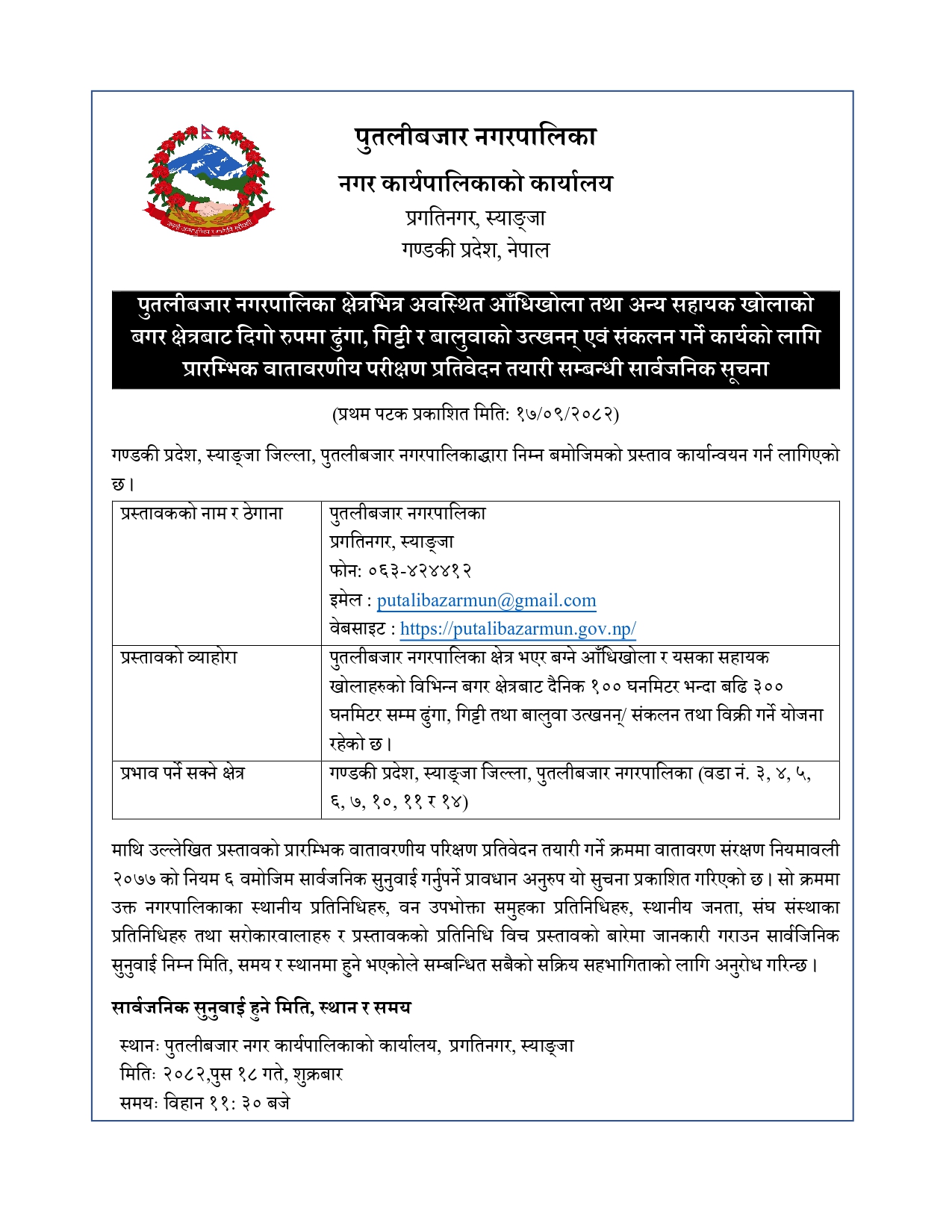 पुतलीबजार नगरपालिका क्षेत्रभित्र अवस्थित आँधिखोला तथा अन्य सहायक खेलाको बगर क्षेत्रबाट दिगो रुपमा ढुङ्गा, गिट्टी र बालुवाको उत्खनन् एवं संकलन गर्ने कार्यको लागि प्रारम्भिक वातावरणीय परीक्षण प्रतिवेदन तयारी सम्बन्धी सार्वजनिक सुनुवाई कार्यक्रम सम्बन्धी सूचना ।