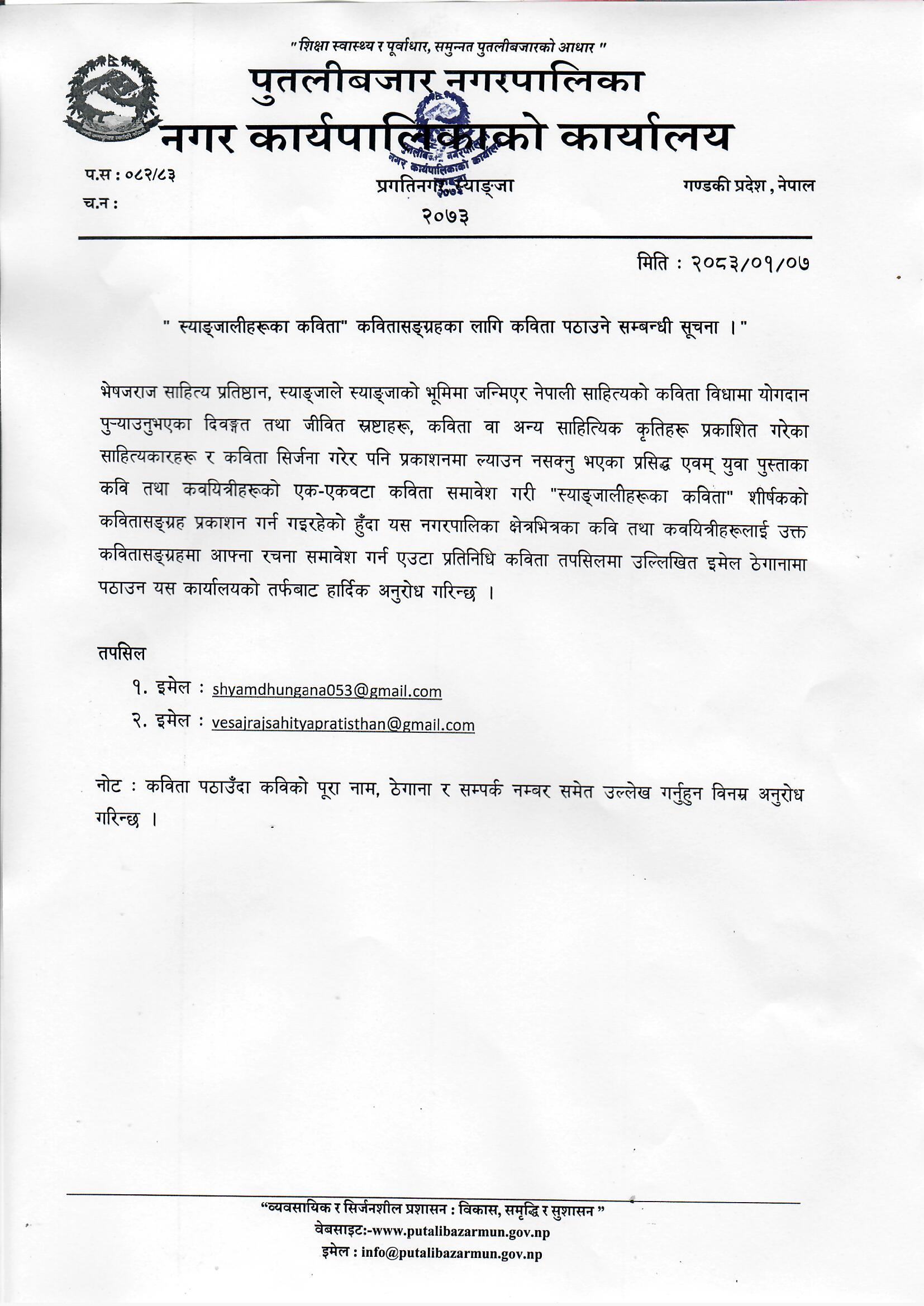 " स्याङ्जालीहरूका कविता" कवितासङ्ग्रहका लागि कविता पठाउने सम्बन्धी सूचना ।