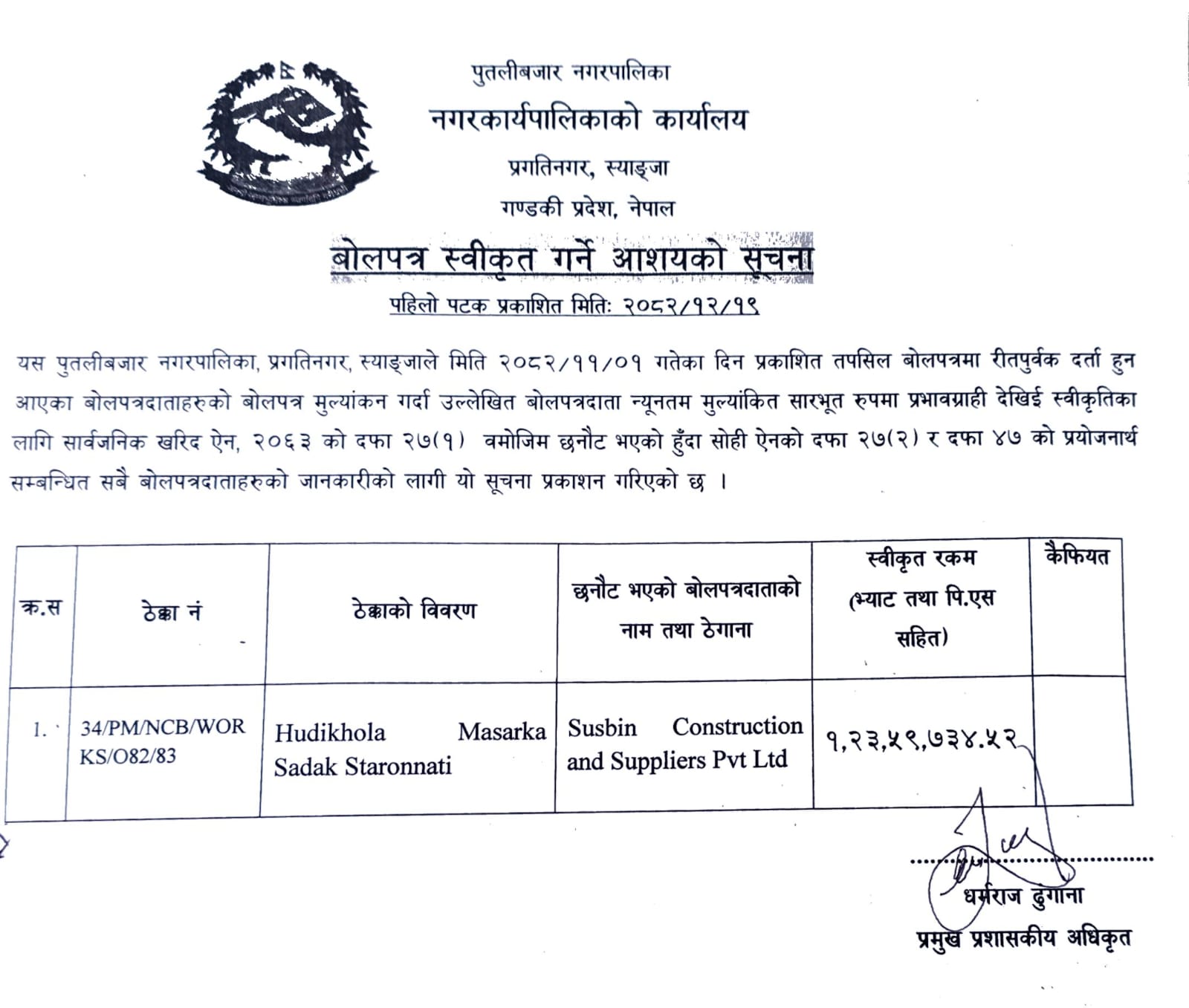 बोलपत्र स्वीकृत गर्ने आसयको सूचना ।
