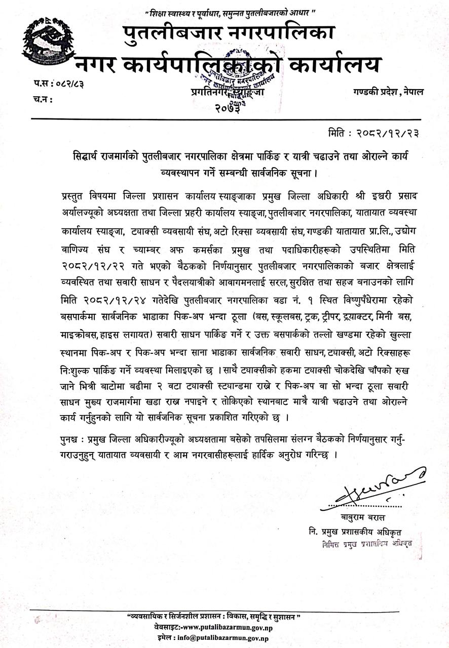सिद्धार्थ राजमार्गको पुतलीबजार नगरपालिका क्षेत्रमा पार्किङ र यात्री चढाउने तथा ओराल्ने कार्य व्यवस्थापन गर्ने सम्बन्धी सार्वजनिक सूचना ।