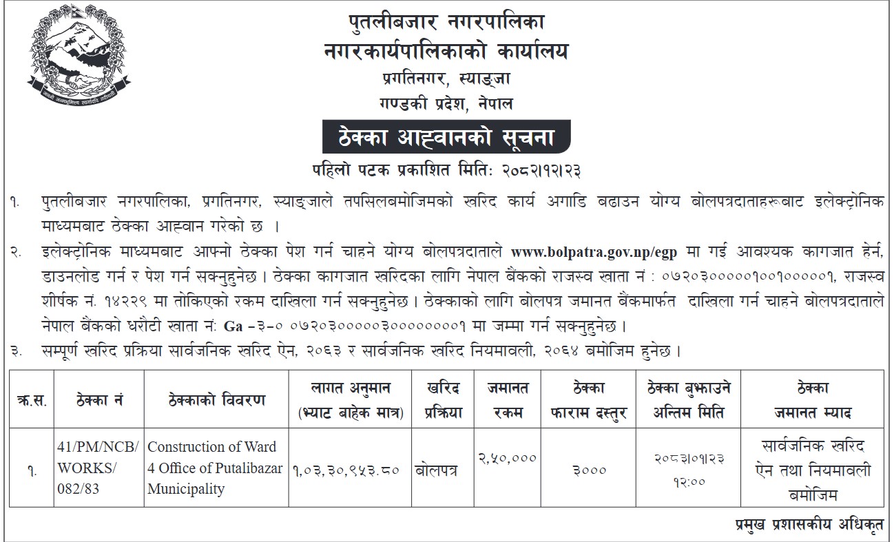 बोलपत्र स्वीकृत गर्ने आसयको सूचना !