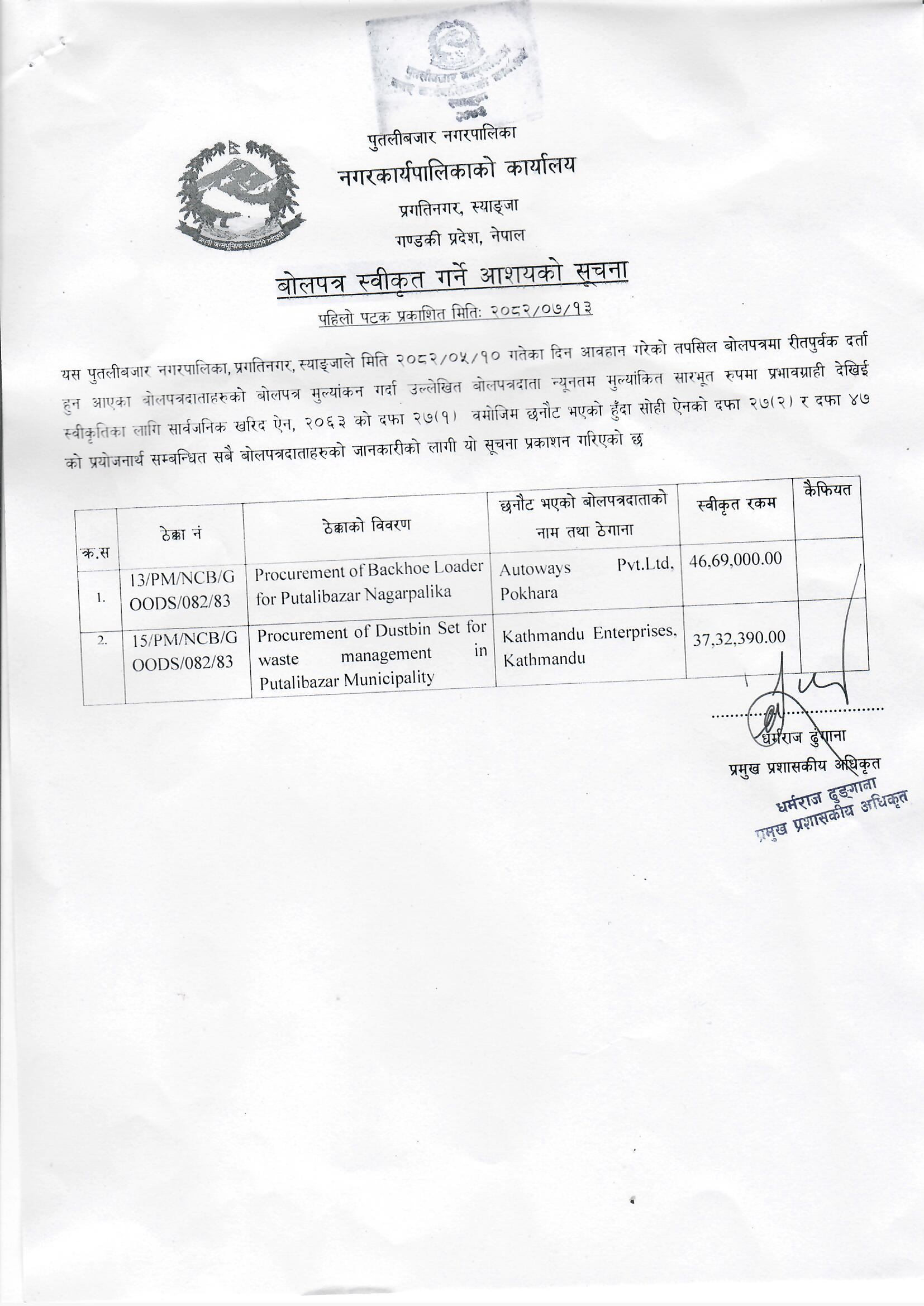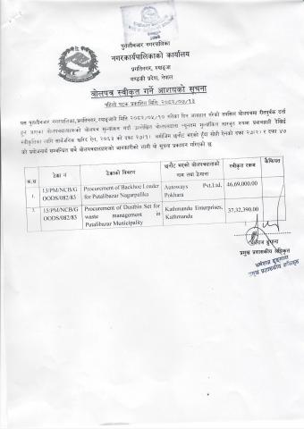 बोलपत्र स्वीकृत गर्ने आशयको सूचना !