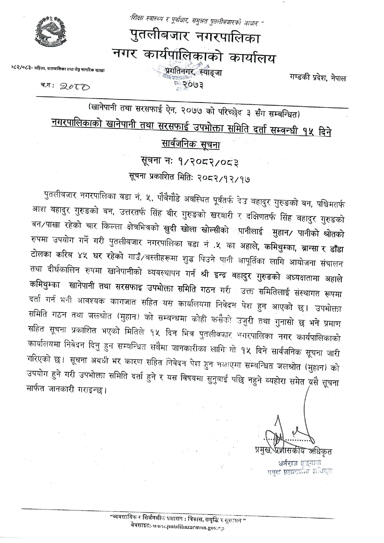 » नगरपालिकाको खानेपानी तथा सरसफाई उपभोक्ता समिति दर्ता सम्बन्धी १५ दिने सार्वजनिक सूचना ।