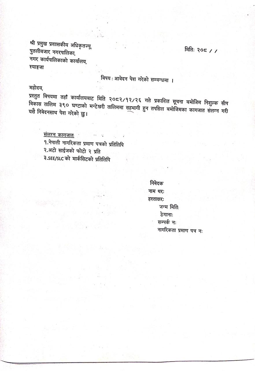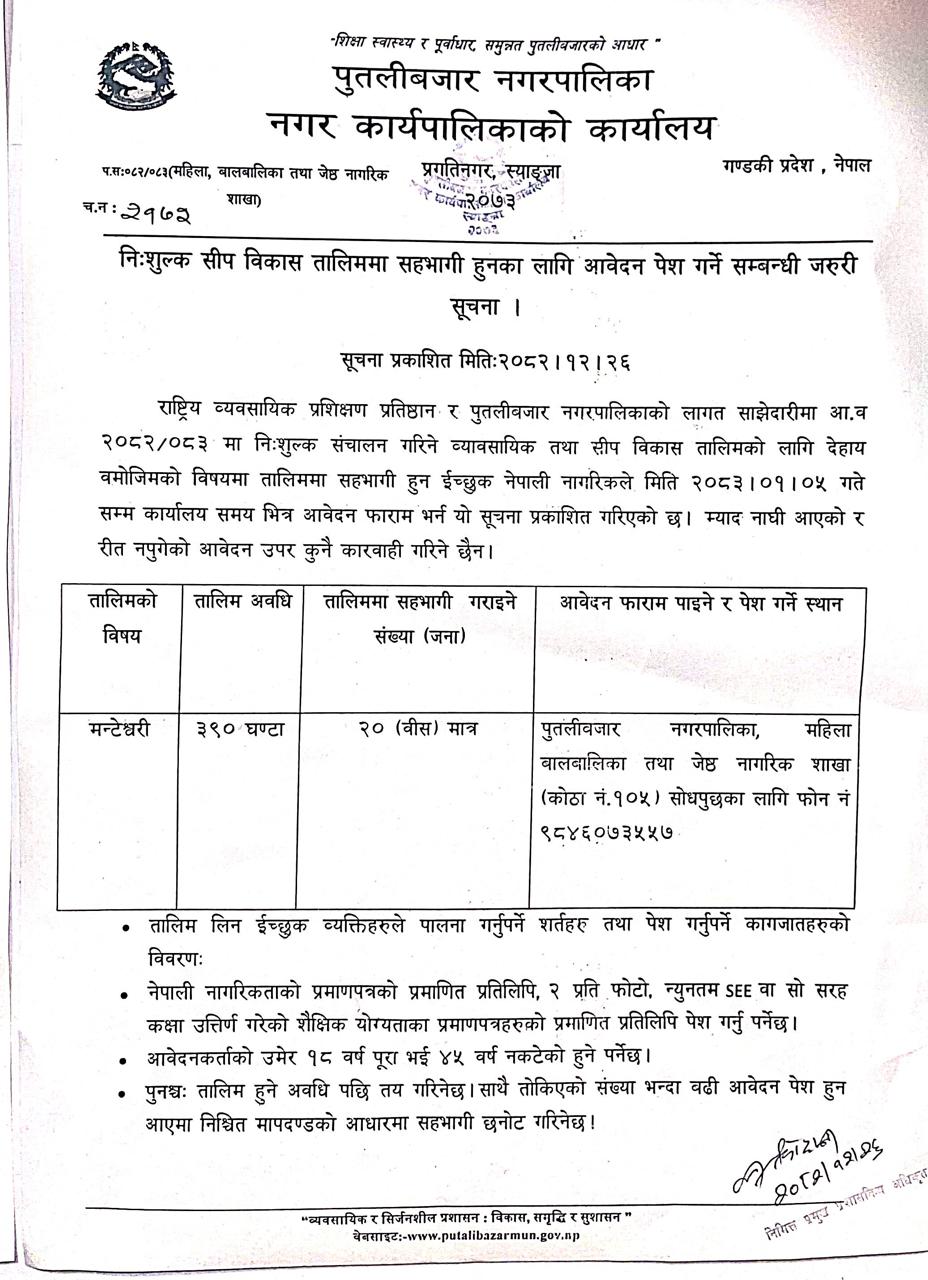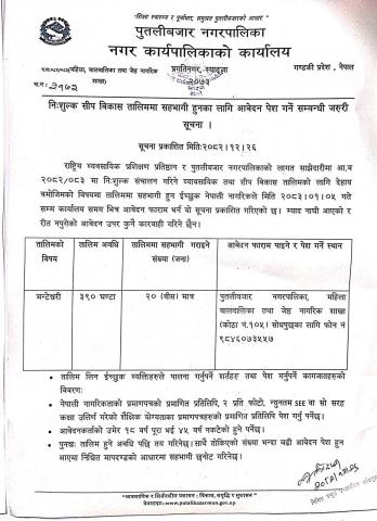 निशुल्क सीप विकास तालिममा सहभागी हुनका लागि आवेदन पेश गर्ने सम्बन्धी सूचना ।