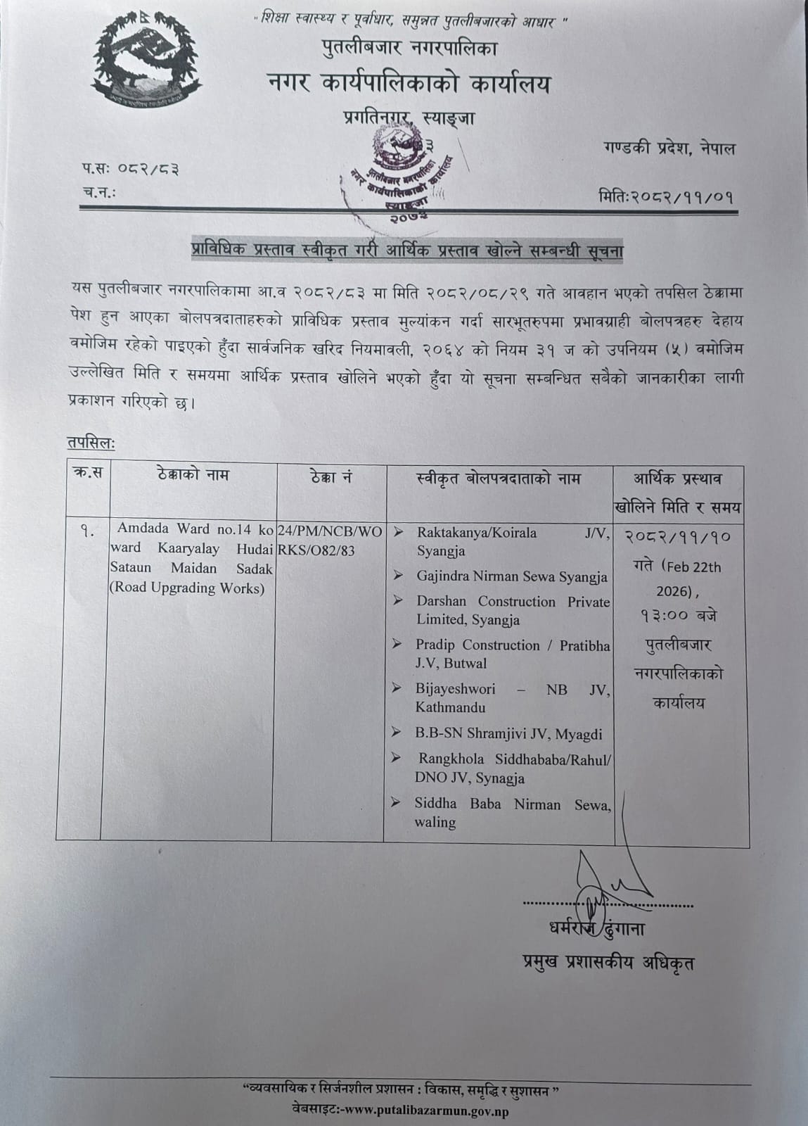 प्राविधिक प्रस्ताव स्वीकृत गरी आर्थिक प्रस्ताव खोल्ने सम्बन्धी सूचना !
