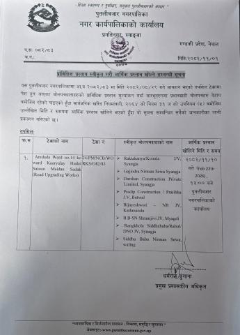 बोलपत्र स्वीकृत सम्बन्धी आशयको सूचना !