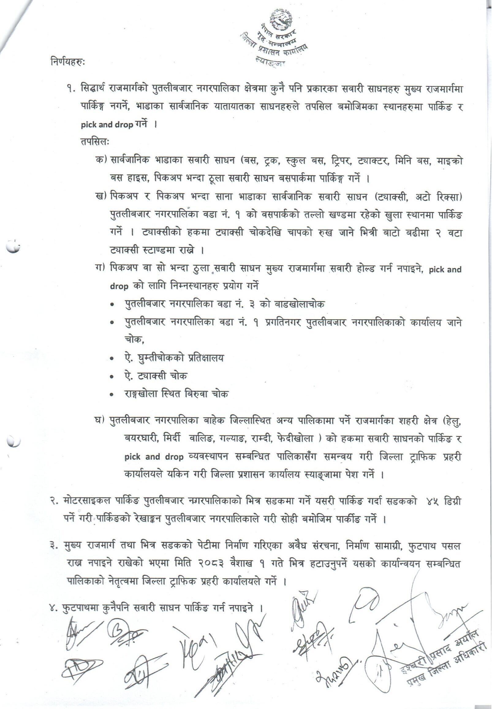 सिद्धार्थ राजमार्गको पुतलीबजार नगरपालिका क्षेत्रमा पार्किङ र यात्री चढाउने तथा ओराल्ने कार्य व्यवस्थापन गर्ने सम्बन्धी सार्वजनिक सूचना ।